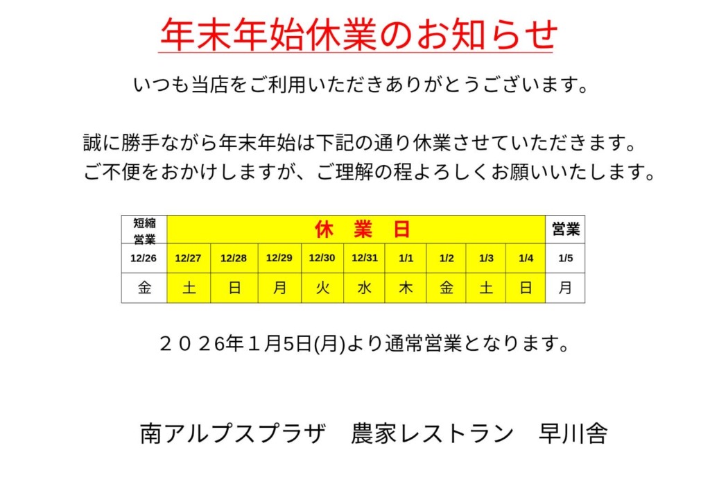 「プラザ早川舎」年末年始の休業につきまして 2025.11.11 農家レストラン「プラザ早川舎」の年末年始の休業日は、下記のとおり 2025/12/27(土)~2026/1/4(日)までとなりますのでお知らせいたします。 ご不便をおかけしますが、何卒ご理解の程よろしくお願いいたします。 Post Share Hatena Pocket feedly Pin it RSS 記事のタイトルとURLをコピーする 山葡萄ワイン「恋紫」ヌーヴォー解禁日決定! 山葡萄ワイン「恋紫」ヌーヴォー解禁!! 最新のお知らせ 2025.12.22 年末年始のオンラインショップにつきまして 2025.12.05 「プラザ早川舎」の営業時間の変更につきまして 2025.12.02 県道南アルプス公園線(湯島地内)法面工事のお知らせ 2025.11.19 「Yショップ麓の直売所」の年末年始の営業について 2025.11.14 山葡萄ワイン「恋紫」ヌーヴォー解禁!! お知らせ一覧