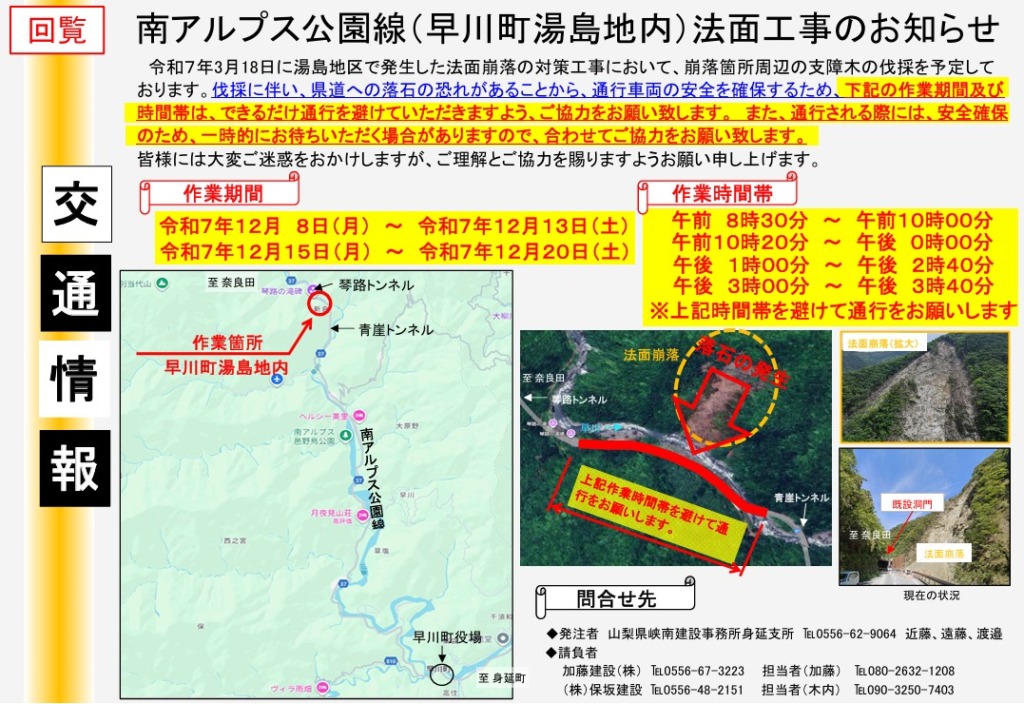 県道南アルプス公園線(湯島地内)法面工事のお知らせ 2025.12.02 下記、添付写真の回覧文通り、県道南アルプス公園線の湯島地内におきまして、法面工事が行われる予定の日には、時間通行止めがありますので、西山方面へお越しのお客様におかれましては、時間帯にご注意ください。 Post Share Hatena Pocket feedly Pin it RSS 記事のタイトルとURLをコピーする 「Yショップ麓の直売所」の年末年始の営業について 最新のお知らせ 2025.12.02 県道南アルプス公園線(湯島地内)法面工事のお知らせ 2025.11.19 「Yショップ麓の直売所」の年末年始の営業について 2025.11.14 山葡萄ワイン「恋紫」ヌーヴォー解禁!! 2025.11.11 「プラザ早川舎」年末年始の休業につきまして 2025.11.06 山葡萄ワイン「恋紫」ヌーヴォー解禁日決定! お知らせ一覧